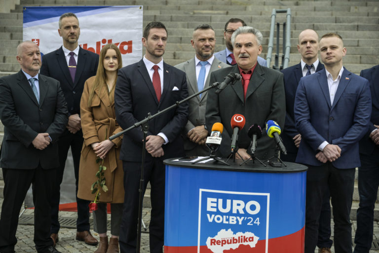 Kandidáti do volieb do EP za hnutie Republika počas tlačovej besedy hnutia Republika, na ktorej predstavili kandidátnu listinu do volieb do Európskeho parlamentu (EP). Bratislava, 8. marec 2024. Foto: SITA/Milan Illík