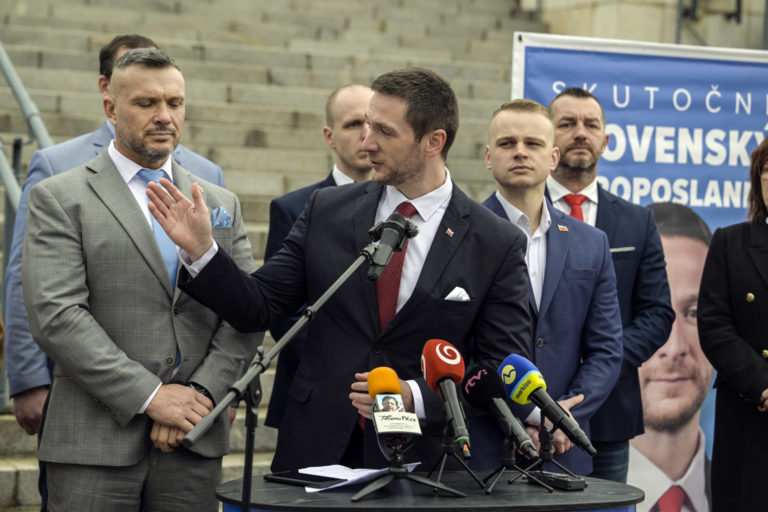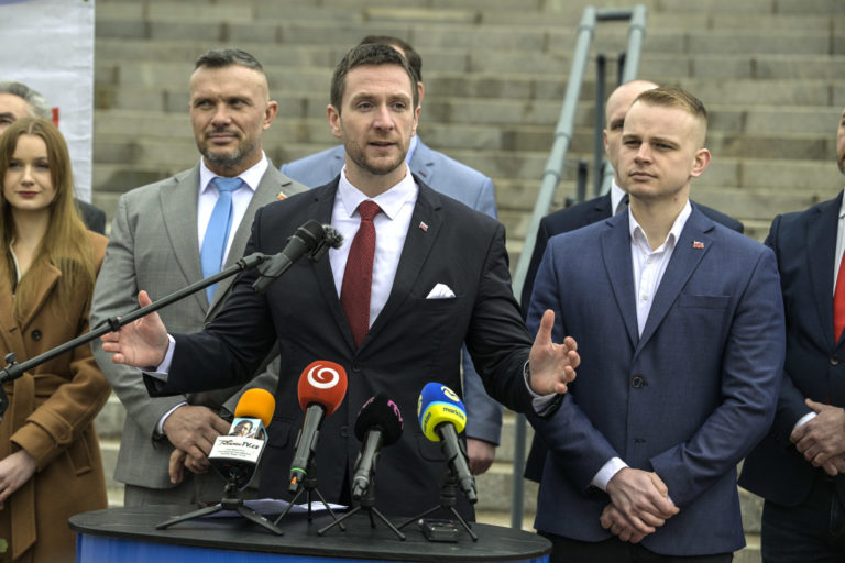 Zľava: Poslanec EP a predseda Republiky Milan Uhrík a podpredseda hnutia Milan Mazurek počas tlačovej besedy hnutia Republika, na ktorej predstavili kandidátnu listinu do volieb do Európskeho parlamentu (EP). Bratislava, 8. marec 2024. Foto: Archívne, SITA/Milan Illík