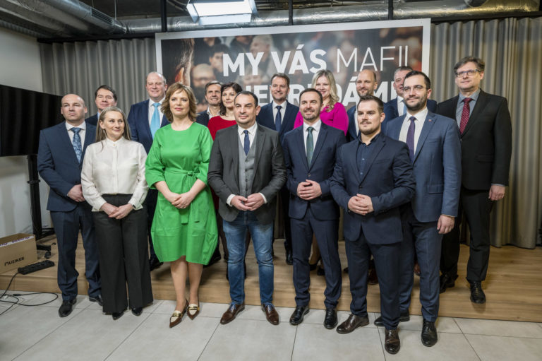 Zľava: Kandidáti do EP Mária Benová, Milan Vetrák, predsedníčka Za ľudí Veronika Remišová, ktorá nekandiduje, kandidáti do EP Ľubomír Galko, predseda hnutia Slovensko Igor Matovič, líder kandidátky a súčasný europoslanec Peter Pollák starší, Anna Andrejuvová, predseda Výboru NR SR pre verejnú správu a regionálny rozvoj Michal Šipoš, Paulína Srovnalíková, Roman Mikulec a Matúš Bystriansky počas predstavenia kompletnej kandidátky hnutia Slovensko a Za ľudí do volieb do Európskeho parlamentu (EP). Bratislava, 13. marec 2024. Foto: archívne, SITA/Milan Illík.