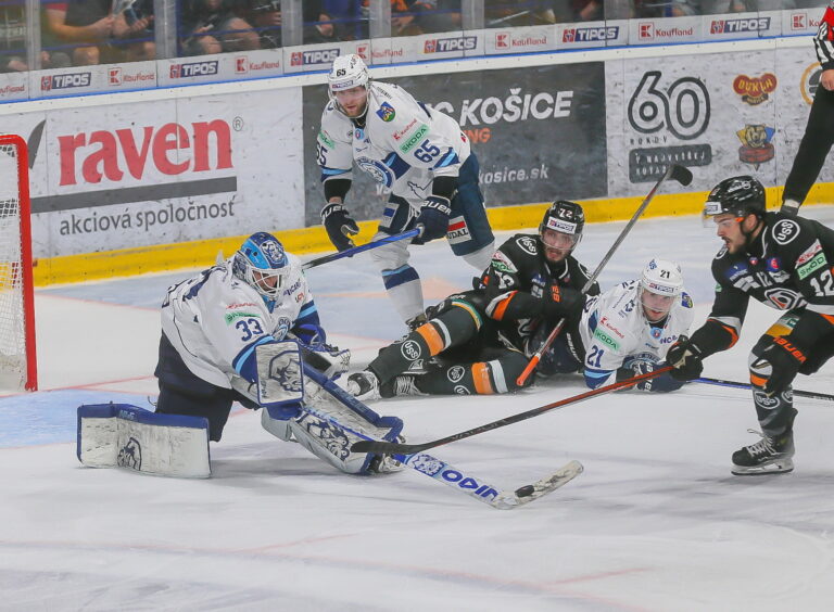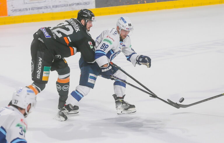 Filip Krivošík z HC Košice a Dávid Okoličány z HK Nitra počas 5. finále hokejovej Tipos extraligy. Košice (Steel Aréna), 25. apríl 2025. Foto: SITA/Peter Jesenský.