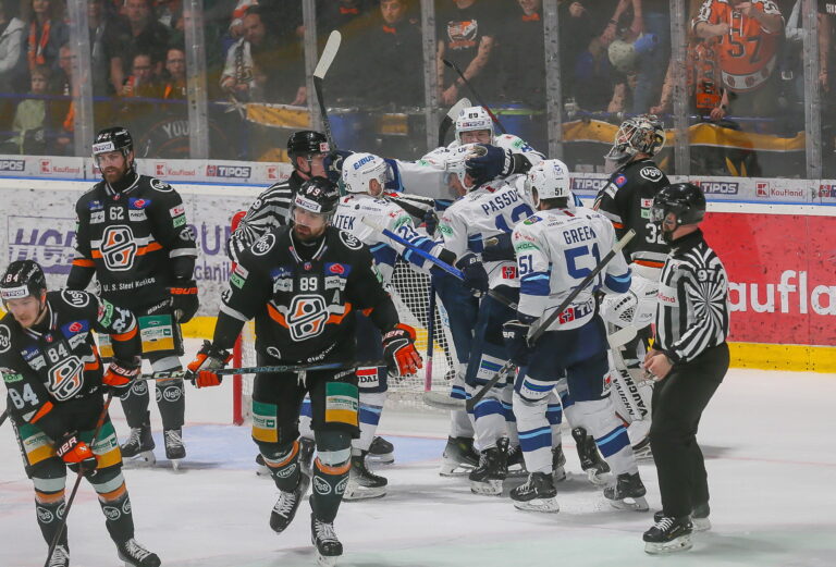 Šarvátka v 5. finále hokejovej Tipos extraligy, v ktorom hráči HK Nitra na ľade HC Košice zvíťazili 4:2. Košice (Steel Aréna), 25. apríl 2025. Foto: SITA/Peter Jesenský.
