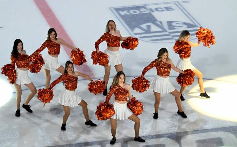 Vystúpenie roztlieskavačiek pred 7. finálovým zápasom medzi HC Košice a HK Nitra. Košice (Steel Aréna), 29. apríl 2025. Foto: SITA/Viktor Zamborský.