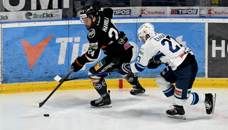 Nitriansky útočník Sebastián Čederle sa snaží zastaviť Matúša Havrilu z HC Košice počas 7. finálového zápasu Tipos extraligy. Košice (Steel Aréna), 29. apríl 2025. Foto: SITA/Viktor Zamborský.