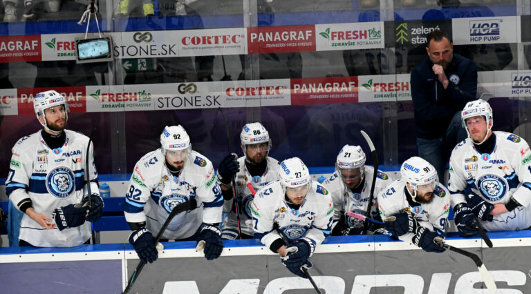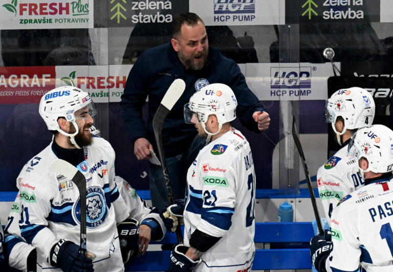 Hráči HK Nitra a tréner Andrej Kmeč (vzadu vpravo) počas zápasu proti HC Košice v 7. finále Tipos extraligy. Košice (Steel Aréna), 29. apríl 2025. Foto: SITA/Viktor Zamborský.