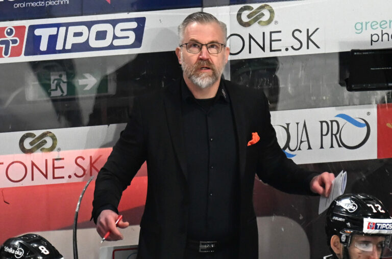 Tréner Andrej Kmeč (HK Nitra) v zápase proti HC Košice v 7. finále Tipos extraligy. Košice (Steel Aréna), 29. apríl 2025. Foto: SITA/Viktor Zamborský.