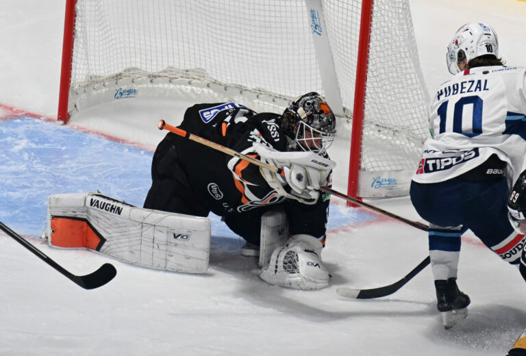 Zákrok nitrianskeho brankára Libora Kašíka v zápase proti HC Košice v 7. finále Tipos extraligy. Košice (Steel Aréna), 29. apríl 2025. Foto: SITA/Viktor Zamborský.