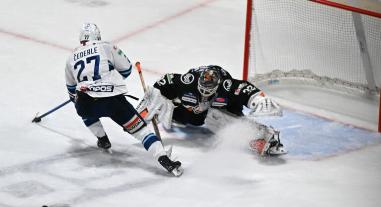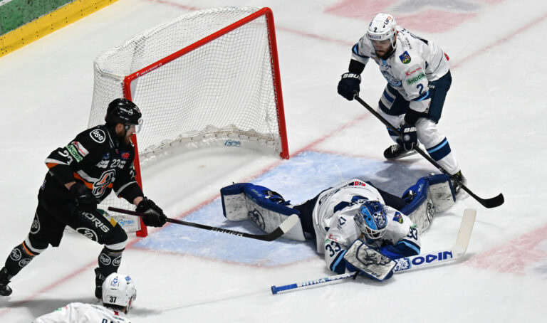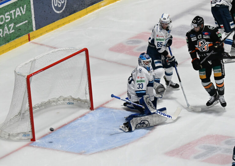 Zákrok brankára Jaroslava Janusa po zakončení nitrianskeho útočníka Sebastiána Čederleho počas 7. finálového zápasu Tipos extraligy. Košice (Steel Aréna), 29. apríl 2025. Foto: SITA/Viktor Zamborský.