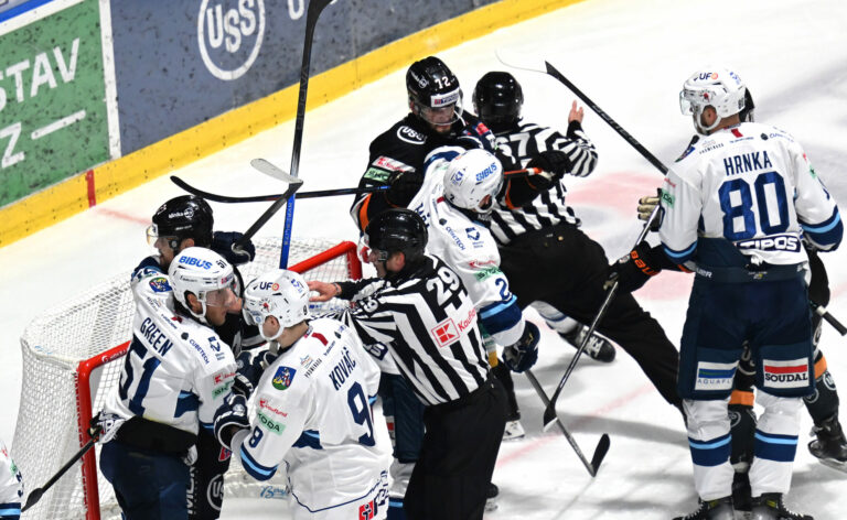 Šarvátka počas 7. finálového zápasu Tipos extraligy medzi HC Košice a HK Nitra. Košice (Steel Aréna), 29. apríl 2025. Foto: SITA/Viktor Zamborský.