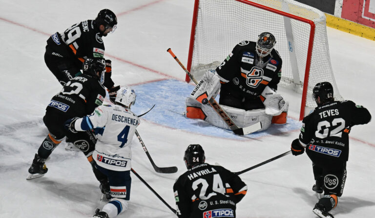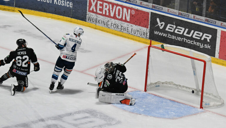 Obranca Josh Teves z HK Košice tečoval puk po prihrávka Jaedona Descheneau z HK Nitra za chrbát brankára Jaroslava Janusa počas 7. finálového zápasu Tipos extraligy. Košice (Steel Aréna), 29. apríl 2025. Foto: SITA/Viktor Zamborský.