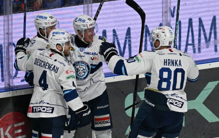 Radosť hráčov HK Nitra po jednom z gólov v sieti HC Košice v 7. finálovom zápase Tipos extraligy. Košice (Steel Aréna), 29. apríl 2025. Foto: SITA/Viktor Zamborský.