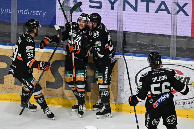Joona Jääskeläinen (druhý zľava) sa teší zo svojho gólu na 1:1 v zápase proti HK Nitra v 7. finále Tipos extraligy. Košice (Steel Aréna), 29. apríl 2025. Foto: SITA/Viktor Zamborský.