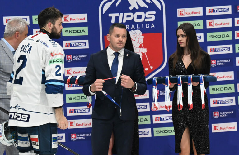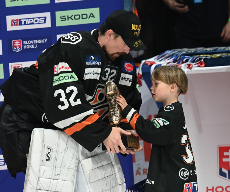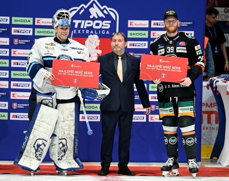 Najlepšími hráčmi finálovej série Tipos extraligy 2024/2025 medzi HC Košice a HK Nitra sa stali brankár Libor Kašík a útočník Brett Pollock. Košice (Steel Aréna), 29. apríl 2025. Foto: SITA/Viktor Zamborský.