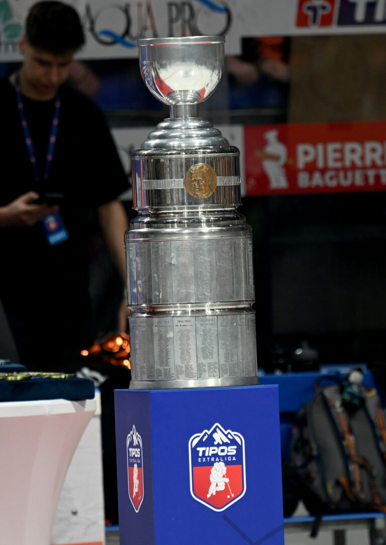 Pohár Vladimíra Dzurillu pre víťaza v Tipos extraligy pripravený na odovzdanie pre hráčov HC Košice, ktorí v 7. finálovom zápase zdolali Nitru 5:4 po predĺžení. Košice (Steel Aréna), 29. apríl 2025. Foto: SITA/Viktor Zamborský.