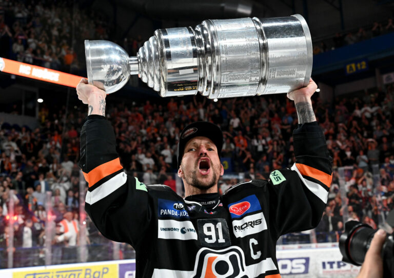 Kapitán HC Košice Michal Chovan s majstrovským Pohárom Vladimíra Dzurillu po 7. finálovom zápase Tipos extraligy, v ktorom "oceliari" zdolali Nitru 5:4 po predĺžení. Košice (Steel Aréna), 29. apríl 2025. Foto: SITA/Viktor Zamborský.