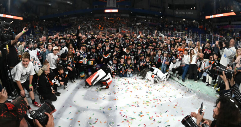 Majstrovský tím HC Košice po 7. finálovom zápase Tipos extraligy 2024/2025, v ktorom "oceliari" zdolali Nitru 5:4 po predĺžení. Košice (Steel Aréna), 29. apríl 2025. Foto: SITA/Viktor Zamborský.