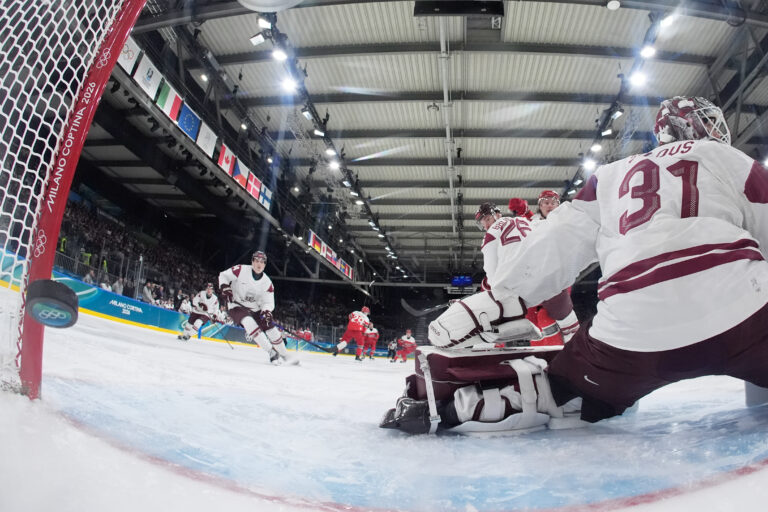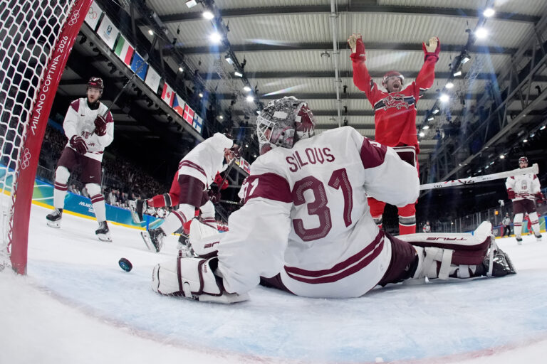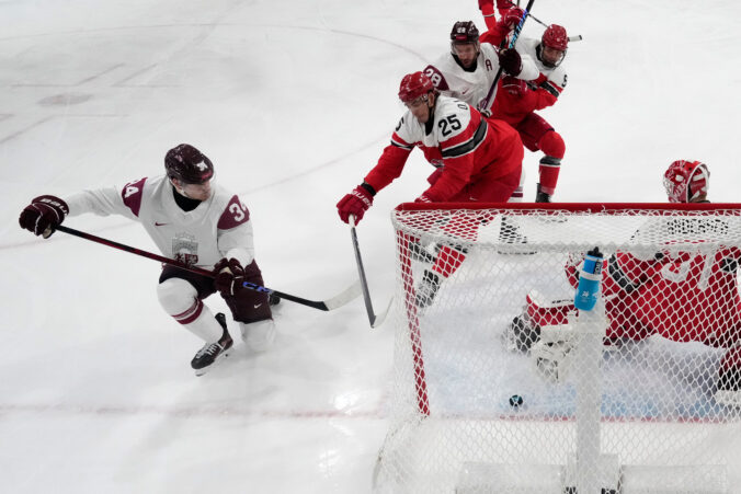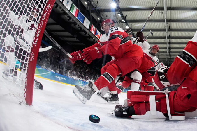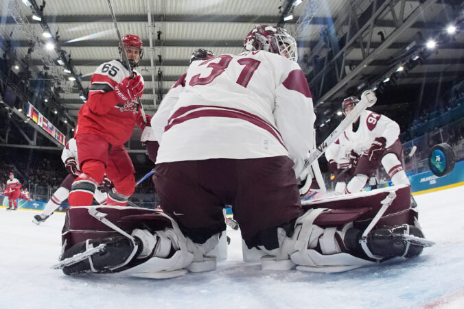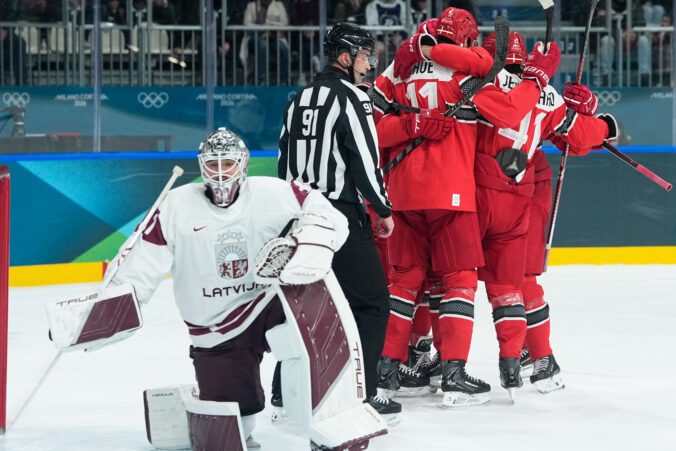 Lotyšský útočník Eduards Tralmaks (34) gólom znižuje na 2:3 v zápase proti Dánsku v základnej C-skupine na zimnej olympiáde. Miláno (Rho Ice Hockey Arena), 15. február 2026. Foto: SITA/AP.