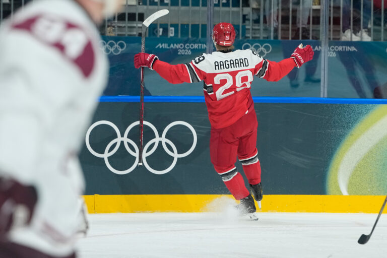 Dánsky útočník Mikkel Aagaard sa teší zo svojho gólu na 2:0 v zápase proti Lotyšsku na zimnej olympiáde. Miláno (Rho Ice Hockey Arena), 15. február 2026. Foto: SITA/AP.