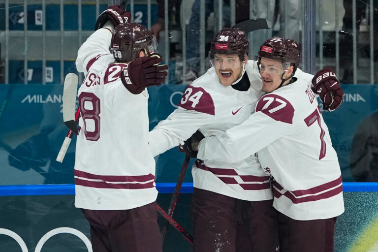 Lotyšský útočník Eduards Tralmaks sa so spoluhráčmi teší zo svojho kontaktného gólu na 2:3 v zápase proti Dánku v základnej C-skupine na olympiáde. Miláno (Rho Ice Hockey Arena), 15. február 2026. Foto: SITA/AP.