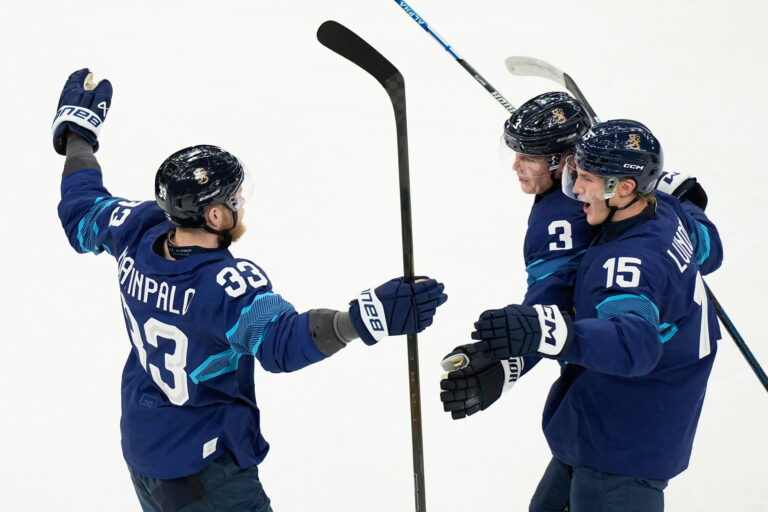 Finland's Nikolas Matinpalo, left, celebrates with teammates after scoring his sides first goal during a preliminary round match of men's ice hockey between Finland and Sweden at the 2026 Winter Olympics, in Milan, Italy, Friday, Feb. 13, 2026. Foto: SITA/AP