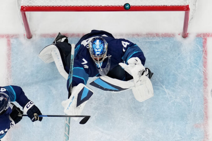 Finland's goalkeeper Juuse Saros makes a save during a preliminary round match of men's ice hockey between Finland and Sweden at the 2026 Winter Olympics, in Milan, Italy, Friday, Feb. 13, 2026. Foto: SITA/AP