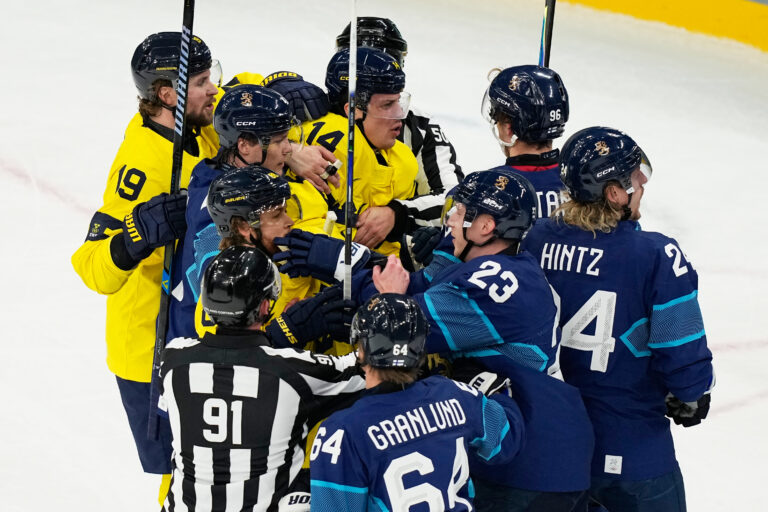 Referees break up a fight during a preliminary round match of men's ice hockey between Finland and Sweden at the 2026 Winter Olympics, in Milan, Italy, Friday, Feb. 13, 2026. Foto: SITA/AP