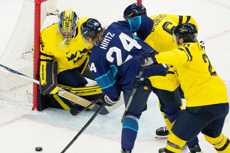 Finland's Roope Hintz, center, tries to score past Sweden's goalkeeper Filip Gustavsson during a preliminary round match of men's ice hockey between Finland and Sweden at the 2026 Winter Olympics, in Milan, Italy, Friday, Feb. 13, 2026. Foto: SITA/AP