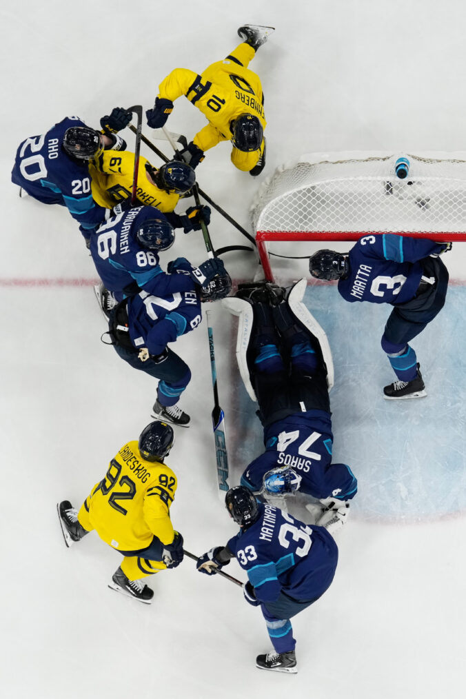 Finland's goalkeeper Juuse Saros, right, and Finland's Esa Lindell make a save against Sweden's Adrian Kempe during a preliminary round match of men's ice hockey between Finland and Sweden at the 2026 Winter Olympics, in Milan, Italy, Friday, Feb. 13, 2026. Foto: SITA/AP