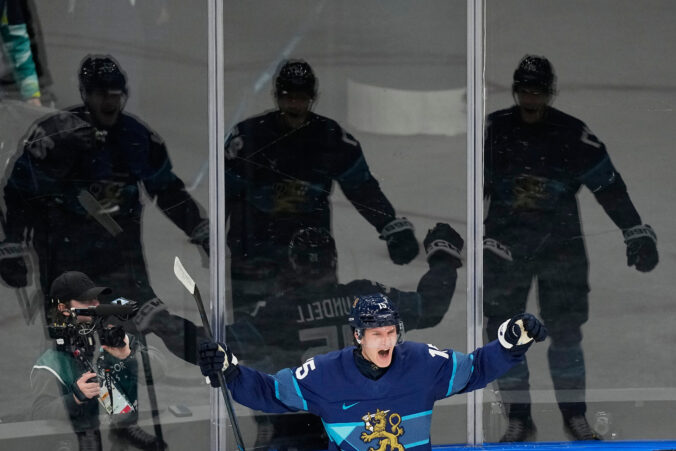 Finland's Anton Lundell celebrates after scoring his sides second goal during a preliminary round match of men's ice hockey between Finland and Sweden at the 2026 Winter Olympics, in Milan, Italy, Friday, Feb. 13, 2026. Foto: SITA/AP
