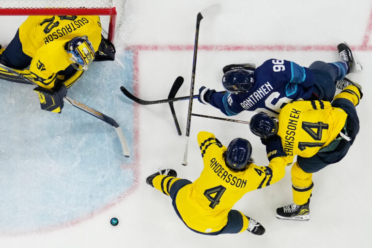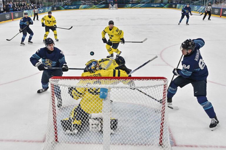 Finland's Anton Lundell, left, scores his team's second goal past Sweden's Filip Gustavsson, during a preliminary round match of men's ice hockey between Finland and Sweden at the 2026 Winter Olympics, in Milan, Italy, Friday, Feb. 13, 2026. Foto: Alexander Nemenov/Pool Photo via AP