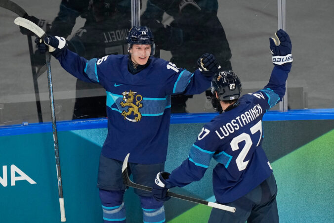 Finland's Anton Lundell, left, celebrates with Finland's Eetu Luostarinen after scoring his sides second goal during a preliminary round match of men's ice hockey between Finland and Sweden at the 2026 Winter Olympics, in Milan, Italy, Friday, Feb. 13, 2026. Foto: SITA/AP