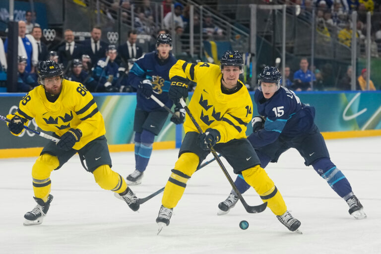 Sweden's Joel Eriksson Ek controls the puck during a preliminary round match of men's ice hockey between Finland and Sweden at the 2026 Winter Olympics, in Milan, Italy, Friday, Feb. 13, 2026. Foto: SITA/AP