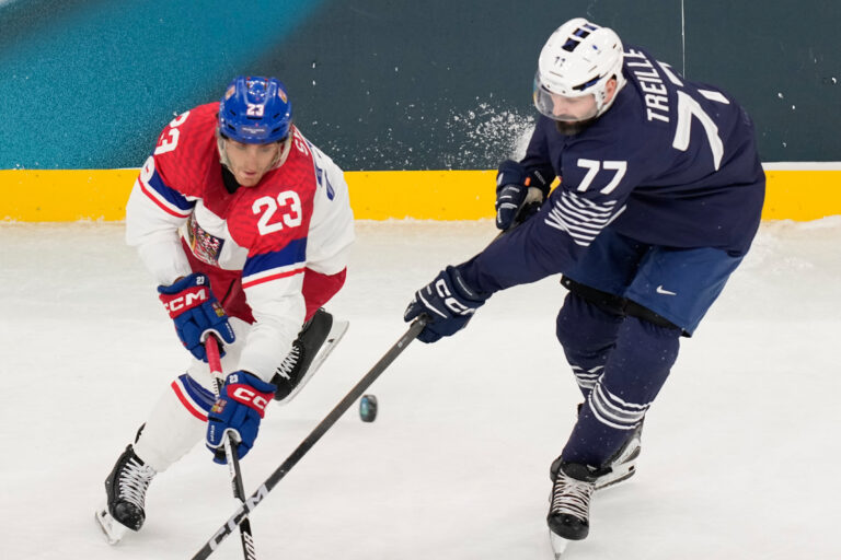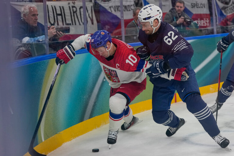 Francúz Sacha Treille v súboji o puk s českým útočníkom Lukášom Sedlákom počas zápasu základnej A-skupiny na zimnej olympiáde. Miláno (Santa Giulia Ice Hockey Arena), 13. február 2026. Foto: SITA/AP.