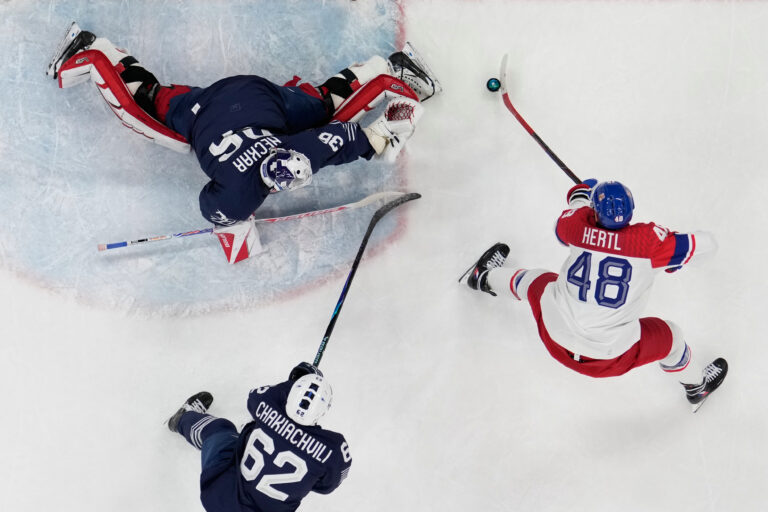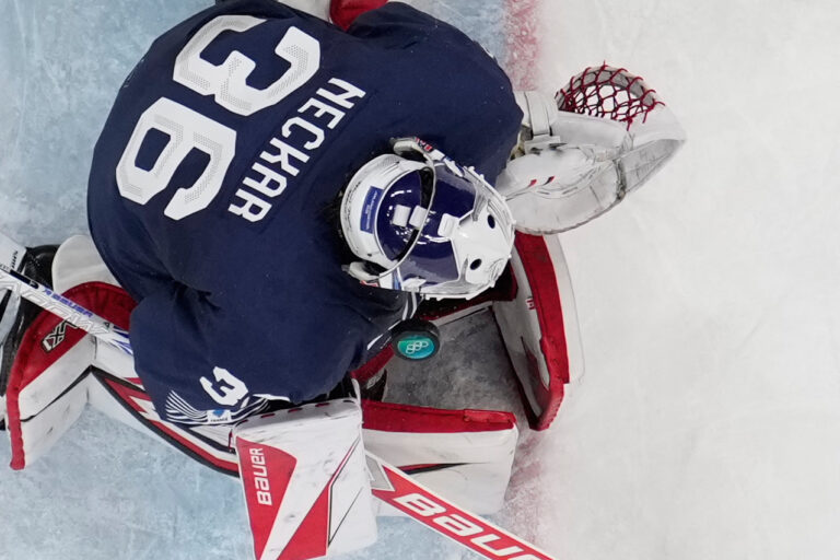 Zákrok francúzskeho brankára Martina Neckara počas zápasu proti Česku v základnej A-skupine na zimnej olympiáde. Miláno (Santa Giulia Ice Hockey Arena), 13. február 2026. Foto: SITA/AP.