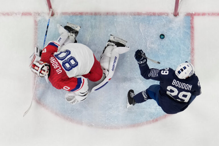 Francúzsky útočník Louis Boudon strieľa gól Čechom v zápase základnej A-skupiny na zimnej olympiáde. Miláno (Santa Giulia Ice Hockey Arena), 13. február 2026. Foto: SITA/AP.