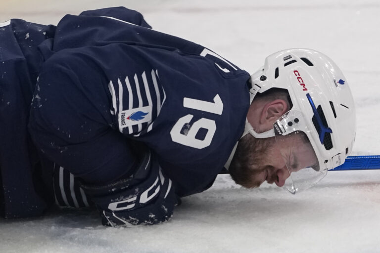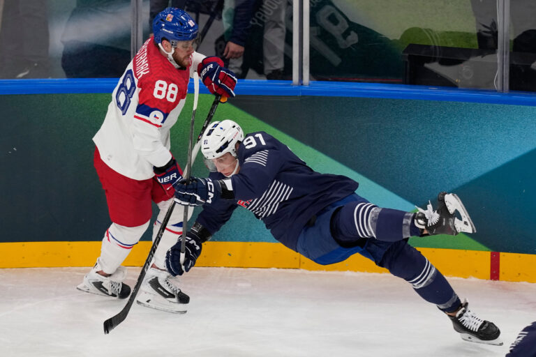 Francúz Floran Douay padá po súboji s českým útočníkom Davidom Pastrňákom počas zápasu základnej A-skupiny na zimnej olympiáde. Miláno (Santa Giulia Ice Hockey Arena), 13. február 2026. Foto: SITA/AP.