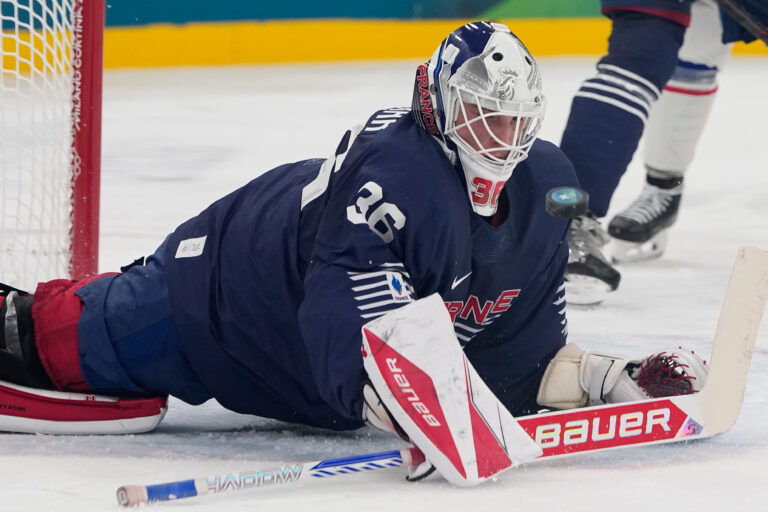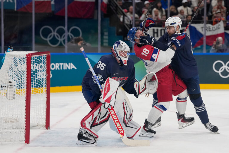 Francúzsky brankár Martin Neckar počas zápasu proti Česku v základnej A-skupine na zimnej olympiáde. Miláno (Santa Giulia Ice Hockey Arena), 13. február 2026. Foto: SITA/AP.