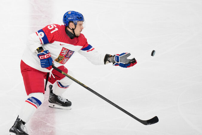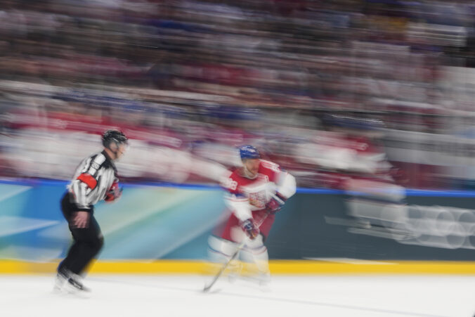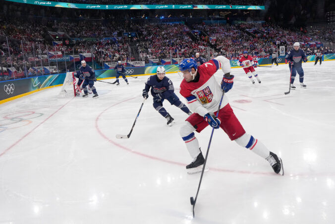 Český útočník David Pastrňák počas zápasu proti Francúzsku v základnej A-skupine na zimnej olympiáde. Miláno (Santa Giulia Ice Hockey Arena), 13. február 2026. Foto: SITA/AP.