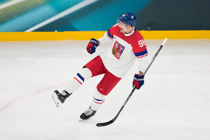Český útočník Martin Nečas sa teší zo svojho gólu na 1:0. v zápase proti Francúzsku v základnej A-skupine na zimnej olympiáde. Miláno (Santa Giulia Ice Hockey Arena), 13. február 2026. Foto: SITA/AP.