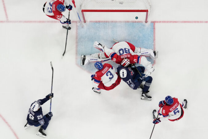 Francúz Hugo Gallet v súboji s českým útočníkom Ondřejom Palátom pred brankárom Martinom Neckarom počas zápasu základnej A-skupiny na zimnej olympiáde. Miláno (Santa Giulia Ice Hockey Arena), 13. február 2026. Foto: SITA/AP.