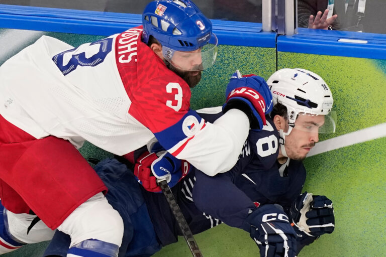 Otrasený Francúz Enzo Cantagallo po súboji s českým obrancom Radkom Gudasom v zápase základnej A-skupiny na zimnej olympiáde. Miláno (Santa Giulia Ice Hockey Arena), 13. február 2026. Foto: SITA/AP.