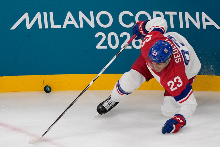 Český útočník Lukáš Sedlák počas zápasu proti Francúzsku v základnej A-skupine na zimnej olympiáde. Miláno (Santa Giulia Ice Hockey Arena), 13. február 2026. Foto: SITA/AP.