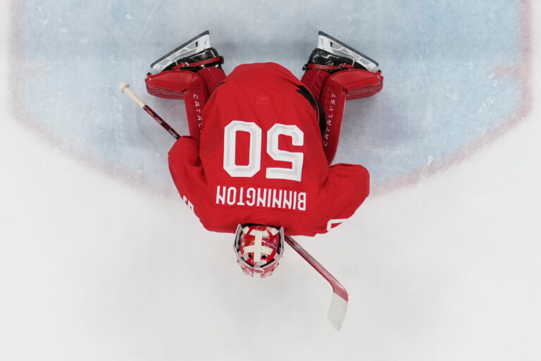 Kanadský brankár Jordan Binnington počas štvrťfinálového zápasu proti Česku na zimnej olympiáde. Miláno (Santa Giulia Ice Hockey Arena), 18. február 2026. Foto: SITA/AP.