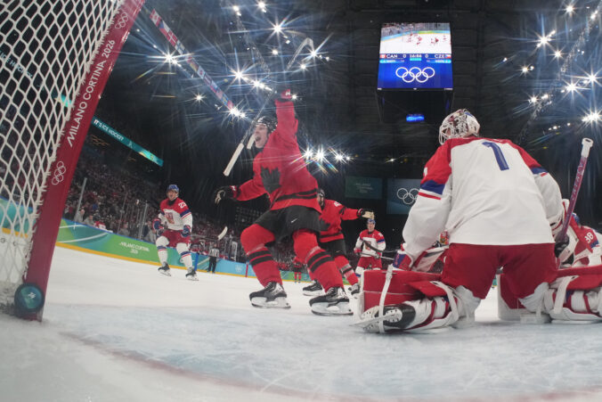 Gól kanadského útočníka Nathana MacKinnona na 2:1 v zápase proti Česku vo štvrťfinále zimnej olympiády. Miláno (Santa Giulia Ice Hockey Arena), 18. február 2026. Foto: SITA/AP.
