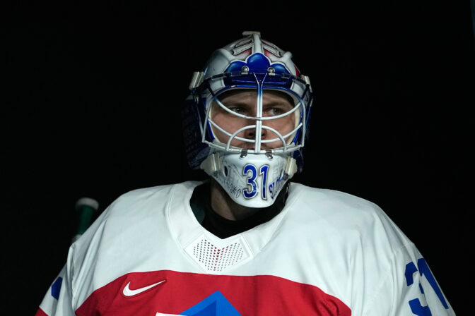 Smutný fínsky brankár Juuse Saros po inkasovanom rozhodujúcom góle počas semifinálového zápasu proti Kanade na zimnej olympiáde. Miláno (Santagiulia Ice Hockey Arena), 20. február 2026. Foto: SITA/AP.