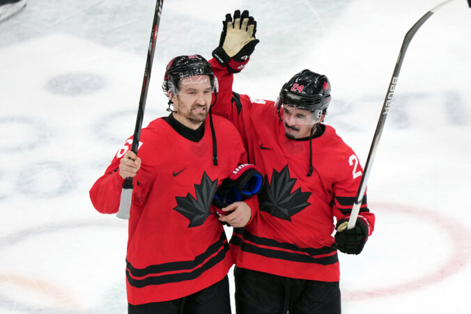 Kanaďania Mark Stone (vľavo) a Seth Jarvis oslavujú výhru nad Finskom v semifinálovom zápase na zimnej olympiáde. Miláno (Santagiulia Ice Hockey Arena), 20. február 2026. Foto: SITA/AP.