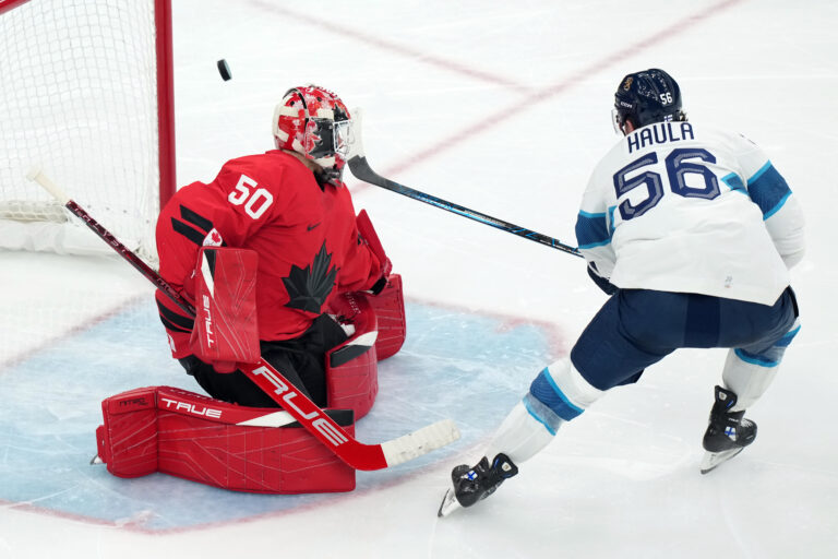 Puk v bránke Fínska po strele Nathana MacKinnona, ktorou rozhodol o výhre Kanady v semifinálovom zápase na zimnej olympiáde. Miláno (Santagiulia Ice Hockey Arena), 20. február 2026. Foto: SITA/AP.
