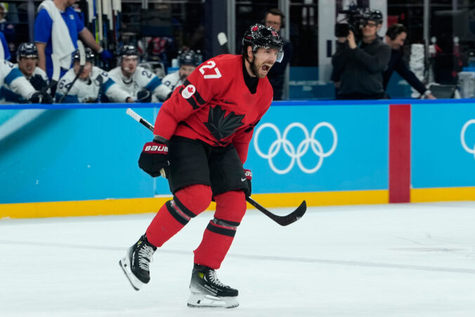 Kanaďan Shea Theodore sa raduje z vyrovnávajúceho gólu počas semifinálového zápasu proti Fínsku na zimnej olympiáde. Miláno (Santagiulia Ice Hockey Arena), 20. február 2026. Foto: SITA/AP.