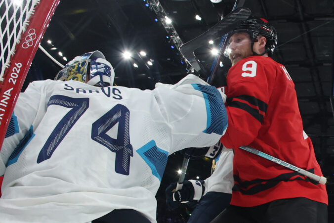 Kanaďan Sam Bennett (vpravo) atakuje fínskeho brankára Juuseho Sarosa počas semifinálového zápasu na zimnej olympiáde. Miláno (Santagiulia Ice Hockey Arena), 20. február 2026. Foto: Bruce Bennett/Pool Photo via AP