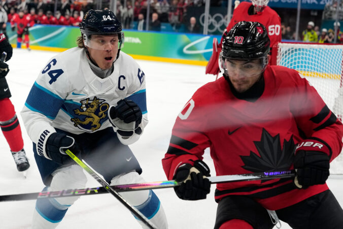 Kapitán Fínska Mikael Granlund (vľavo) v súboji s Kanaďanom Nickom Suzukim počas semifinálového zápasu na zimnej olympiáde. Miláno (Santagiulia Ice Hockey Arena), 20. február 2026. Foto: SITA/AP.