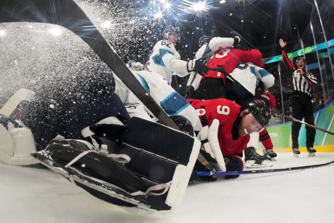 Jeden zo zákrokov fínskeho gólmana Juuseho Sarosa v zápase proti Kanade v semifinále zimnej olympiády. Miláno (Santagiulia Ice Hockey Arena), 20. február 2026. Foto: SITA/AP.